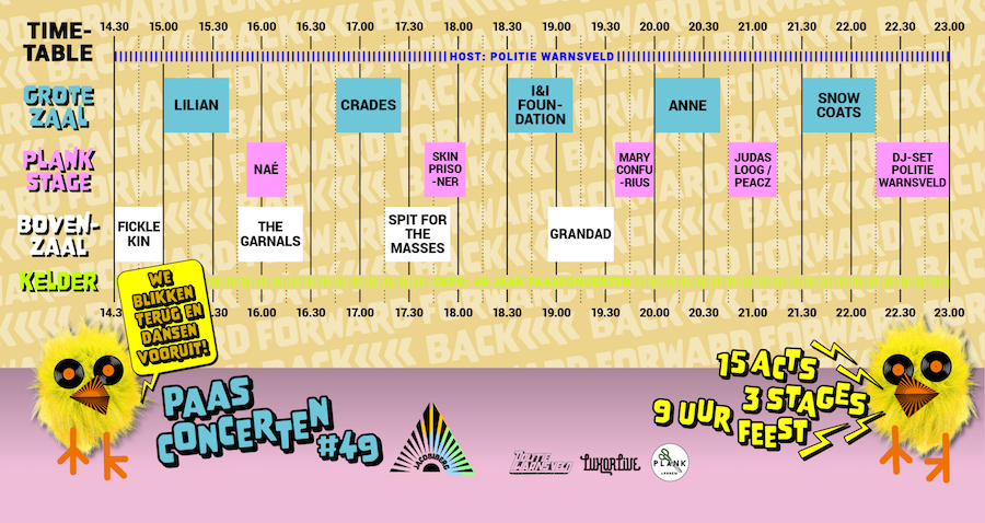 De line-up wordt traditiegetrouw een fijne weerspiegeling van de muzikale diversiteit die te vinden is in Jacobiberg en daarbuiten, oftewel: een vette verzameling aan muzikaal, lokaal talent. Kom met eigen ogen en (konijnen)oren ervaren waarom de Jacobiberg Paasconcerten al bijna een halve eeuw hét popfestival van Arnhem is!